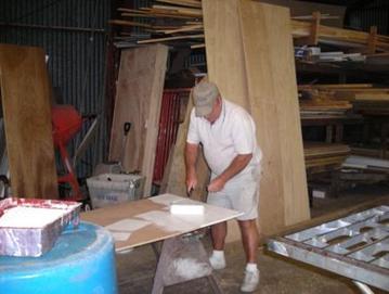 priming the plywood for doors that were fabricated to replace the badly